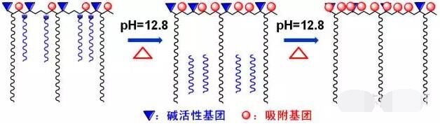 其次,快速水解型聚醚單體應(yīng)用,由于水泥水化前期速度較快,自由水消耗較多,在低自由水量前提下,通過調(diào)控水解釋放速率與側(cè)鏈脫落、水化掩埋之間的平衡,既有效降低前期流動度損失,又避免后期反向增長。快速水解提供分散動力作用示意圖如下:
