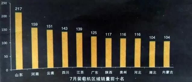 今年前7月,除2月份出口量不足800臺,其它月份出口數(shù)量基本均在1000~1300臺的區(qū)間內(nèi)上下波動,相對比較平穩(wěn)。分區(qū)域來看,山東省繼續(xù)保持領先,7月份銷量達到217臺,其余省份銷量均未達到200臺,天津、上海、青海、海南、西藏等仍是銷量最少的省、市、自治區(qū)。