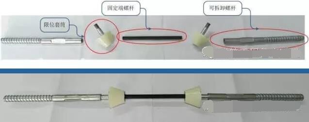 根據(jù)對日本已完清水混凝土工程考察結(jié)果,日方在施工中均采用三接頭的對拉螺桿,施工中有效解決了螺桿眼部位的失水漏漿的問題,有效避免了熊貓眼的發(fā)生。為了有效保護清水模板的表面,通過多輪試驗對比,特別研制出了五段式對拉螺桿。