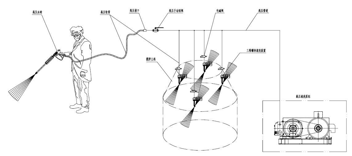 高壓清洗設備主機+三維旋轉清洗裝置,維護保養(yǎng)攪拌機內壁的清洗利器!
