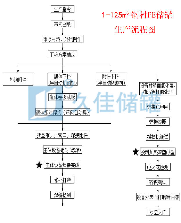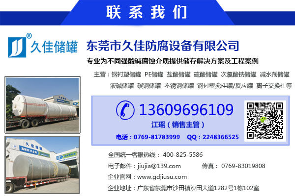 東莞久佳生產(chǎn):久塑牌(1-125m3)立/臥式鋼襯塑(PE/PO)/碳鋼/不銹鋼儲罐、(5-50m3)管口一體成型PE儲罐、鋼襯塑攪拌罐/反應(yīng)罐/過濾罐/中和罐、離子交換柱、鹽酸儲罐、硫酸儲罐、次氯酸鈉儲罐、液堿儲罐、硝酸儲罐、減水劑儲罐、化工儲罐、酸堿儲罐等防腐儲存容器設(shè)備;公司規(guī)模和產(chǎn)品質(zhì)量在國內(nèi)處于領(lǐng)先地位。