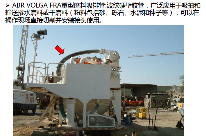 應用范圍: 波紋硬壁膠管,廣泛用于吸抽和輸送摻水磨料或者只是粉 塵(砂,礫石,水泥,種子等), 可以在操作現(xiàn)場直接切割并安裝 接頭使用