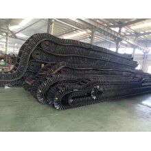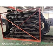 大傾角擋邊輸送帶的基帶是由上覆蓋膠、下覆蓋膠、帶芯和橫向剛性層四部分組成。上覆蓋膠厚度一般為3-6mm;下覆蓋膠厚度一般為1.5-4.5mm,帶芯材料承受拉力,其材料可以是棉帆布(CC)、尼龍帆布(NN)、聚酯帆布(EP)或鋼繩芯(ST)。為了增加基帶的橫行剛性,在芯體上下添加特殊加強(qiáng)層,稱橫向剛性層?;鶐У膶挾纫?guī)格,與普通膠帶相同,符合GB7984-2001的標(biāo)準(zhǔn)規(guī)定。