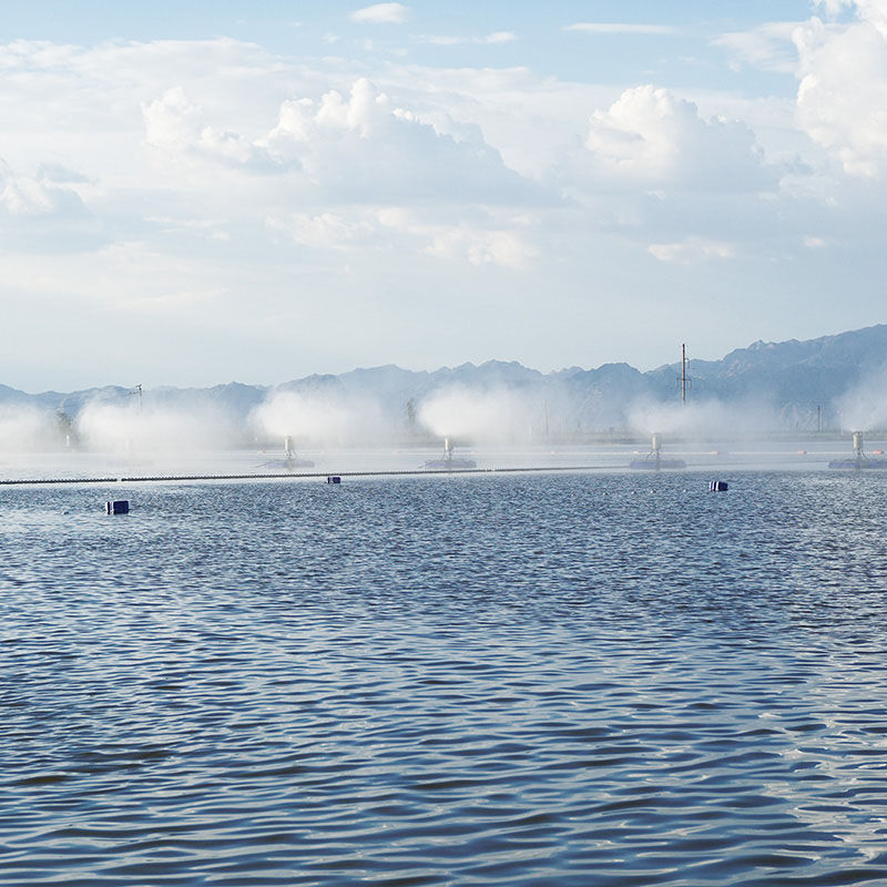 通過高速旋轉(zhuǎn)葉輪將水破碎至100微米粒徑小液滴,形成水霧,利用自然天氣條件進(jìn)行蒸發(fā)。強(qiáng)制蒸發(fā)的作用:可增強(qiáng)蒸發(fā)效果14~30倍,蒸發(fā)同樣的廢水所需蒸發(fā)塘面積可降低到原來的1/10。