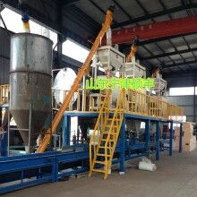 外墻保溫板設(shè)備又名水泥粉煤灰復(fù)合莢芯墻板設(shè)備”是以聚苯乙烯加粉煤灰、礦渣和外加劑等,復(fù)合而成的輕質(zhì)墻體板材。“水泥粉煤灰復(fù)合莢芯墻板”主要生產(chǎn)工序包括,砂漿攪拌、砂漿鋪覆、復(fù)合玻璃纖維布、輥壓、鋪聚苯板、砂漿鋪覆、復(fù)合玻璃纖維布、輥壓成型、養(yǎng)護、脫模、切割、堆放等步驟。產(chǎn)品采用機械化流水線生產(chǎn)。