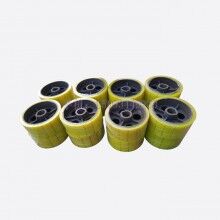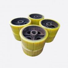 滾筒350混凝土攪拌機聚氨酯膠輪 黃色掛膠托輪滾輪 摩擦輪。直徑300mm,寬度130mm,軸孔54mm。攪拌機膠輪亦稱托輪、滾輪、承重輪、支撐輪,廣泛應用于建筑機械行業(yè)設備中的滾筒式混凝土攪拌機上,通過滾筒下部兩邊的膠輪摩擦驅動使?jié)L筒轉動,以達到攪拌的目的。膠輪內部輪芯骨架為鑄鐵制造,外圍為優(yōu)質耐磨橡膠,能有效防止膠輪與攪拌機筒身運轉過程中橡膠脫落、分層、掉渣、掉抹等不良現(xiàn)象的發(fā)生。手機:15093449233 QQ:632378000