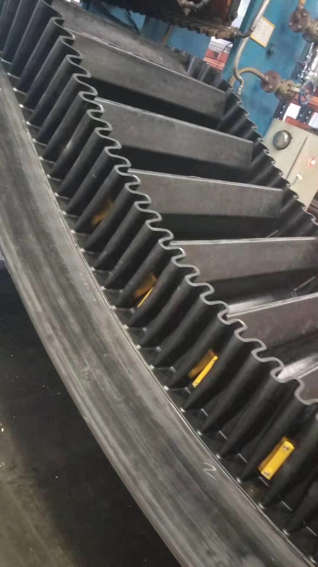大傾角波狀擋邊帶由基帶、擋邊、橫隔板3部分組成。擋邊起防止物料測(cè)滑撒落的作用。為便于繞過滾筒,檔邊設(shè)計(jì)成波紋狀;橫隔板的作用是承托物料,為了實(shí)現(xiàn)大傾角輸送,采用TTC型。檔邊和橫隔板是用二次硫化的方法與基帶連接的,具有很高的連接強(qiáng)度。