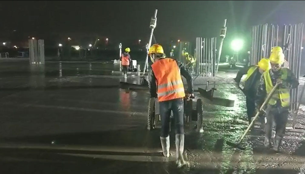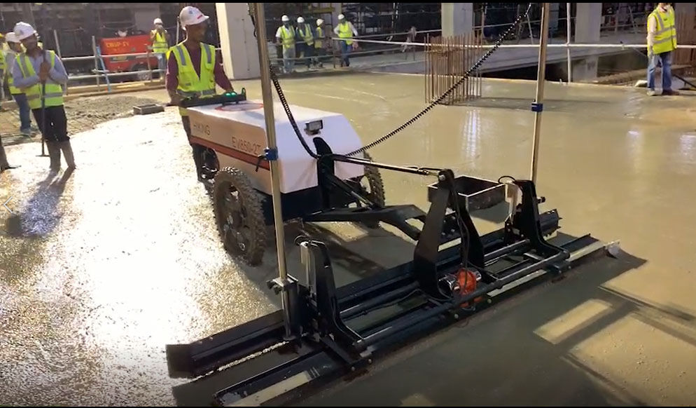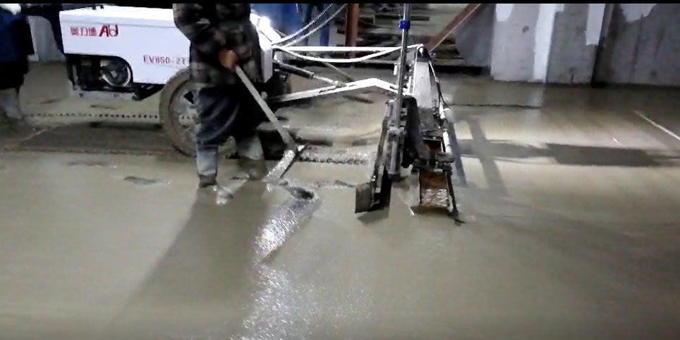 混凝土激光攤鋪機是用刮板將高出的混凝土帶走并初步刮平,達到設計要求的標高。液壓驅(qū)動振動馬達產(chǎn)生震動,頻率為4000次/分鐘,帶動整個振動板一起對混凝土產(chǎn)生振搗。激光攤鋪機找平不需要拉控制線,也不需要支側(cè)模板來控制地面標高,而由攤鋪機上的激光測控系統(tǒng)實時控制,只要激光發(fā)射器不受干擾,無論攤鋪機移動到哪里,都能確保鋪筑后的地面整體上的標高不受影響。