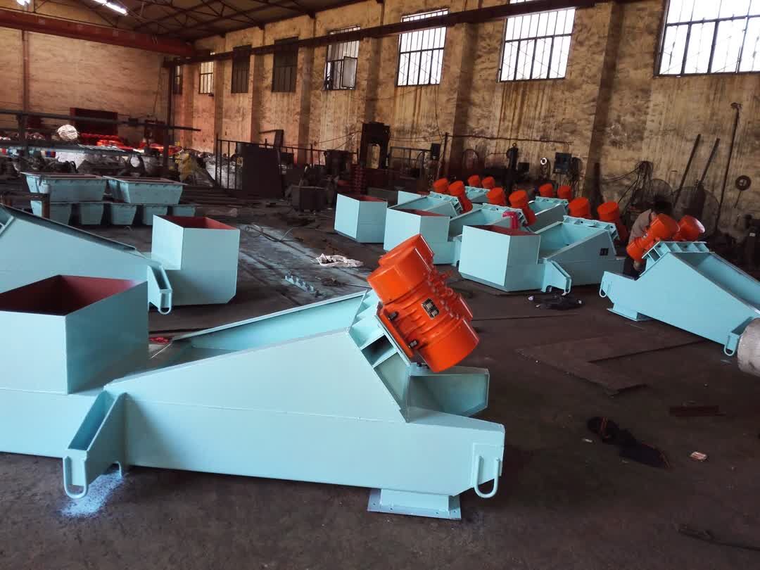電機(jī)振動(dòng)給料機(jī)的給料過程是利用特制的振動(dòng)電機(jī)驅(qū)動(dòng)給料槽沿傾斜方向作周期直線往復(fù)振動(dòng)來實(shí)現(xiàn)的,當(dāng)給料槽振動(dòng)的加速度垂直分量大于重力加速度時(shí),槽中的物料將被拋起,并按照拋物線的軌跡向前跳躍運(yùn)動(dòng),拋起和下落1/50秒內(nèi)完成,由于振動(dòng)電機(jī)的連續(xù)激振,給料槽連續(xù)振動(dòng),槽中的物料則連續(xù)向前跳躍,以達(dá)到給料目的。