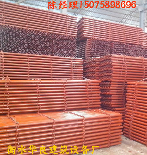 河北衡水華良建筑器材聯(lián)系電話:150-7589-8696 ,輪扣腳手架、碗扣腳手架、快拆式腳手架、承插式新型腳手架、直插式腳手架、鋼管腳手架、建筑腳手架,新型建筑支撐,腳手架,模板支撐,新型模板支撐, 新型建筑支撐。這種新型材料的特點(diǎn)是:耐腐蝕,彈性大,堅(jiān)固不變形。易搭拆腳手架,施工速度快的腳手架。 每根支撐桿可以支撐3-4噸左右,兩根主龍脊之間可以承重2-2.5噸的重量,每根副龍脊可以承重1噸?,F(xiàn)在工地現(xiàn)澆水泥一般厚度也就是10-15厘米,同等面積重量最多100-150公斤,所以這個(gè)支撐力度一般高層建筑完全夠用。