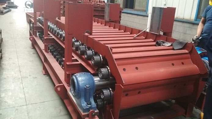 3) 垃圾成分的復雜性,易抱團,不易分散,從受料斗中拉出時 ,板式給料機上料層較厚,易間斷性成堆地掉入下道設備,給下道設備帶來新的難題。 為了保證從料斗中拉出的垃圾能均勻地送入下道設備 ,在板式給料機頭部卸料位置設有一均勻撥料滾筒,其左右、 上下位置均可調(diào)整,以保證能均勻布料。