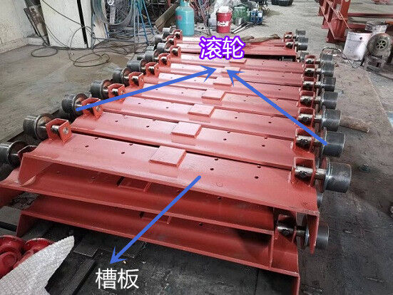 承載構(gòu)件——滾輪采用了滾動軸承結(jié)構(gòu),有利于減小運行阻力,減少動力消耗。該結(jié)構(gòu)型式便于維護。滾輪由支承座和槽板固定,滾輪在軌道上滾動,帶動槽板和槽板上的物料運動。