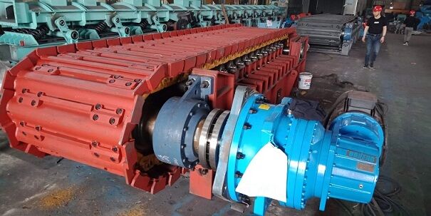 鏈板組件直接承受礦倉物料壓力和運(yùn)送物料。鏈板組件由輸送板、牽引鏈軌及其聯(lián)接螺栓組成。輸送板采用搭接式結(jié)構(gòu)。輸送板材質(zhì)為高錳鋼,鑄造成型,相互搭接,輸送板用螺栓固定在鏈軌上。這種板不僅重量輕、不漏礦,而且強(qiáng)度高、耐磨損、抗沖擊。