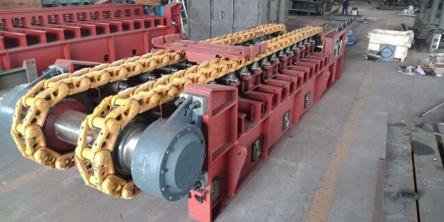 座部件由機(jī)架和支承件組成。機(jī)架由鋼材焊接而成,支承部件有支重輪、下托輪和縱向?qū)к?,輸送板得到支重輪和縱向?qū)к壍碾p重支持,使支重更均勻合理。牽引鏈基本上不受礦石和自重產(chǎn)生的張力作用,支重輪外側(cè)設(shè)計有凸臺,與主、從動輪聯(lián)合作用,成功地杜絕鏈軌跑偏。在機(jī)架下方設(shè)有下托輪,為方便維修,下托輪為側(cè)裝式。