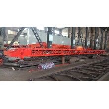2 用吊車將布料皮帶輸送機(jī)吊起,如有必要再用手拉葫蘆調(diào)平,用二根連接銷軸與三角支架連接,將布料皮帶輸送機(jī)放在安全凳上(安全凳應(yīng)置于布料皮帶輸送機(jī)最前端)。