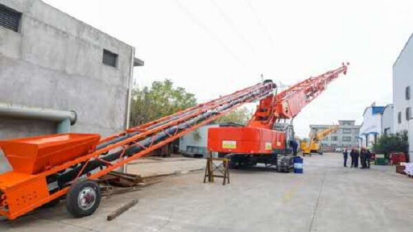 我公司生產(chǎn)的可移動式混凝土運(yùn)輸、澆筑設(shè)備——自行帶式混凝土布料機(jī),小時澆筑強(qiáng)度可達(dá)270m3。為了解決混凝土布料機(jī)的供料問題,自行研制了可移動式上料平臺。