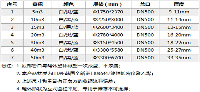 特點:所用材質為韓國進口聚乙烯(PE)滾塑原料,儲罐一次成型,內外光滑,具有良好的衛(wèi)生性與抗紫外線能力,耐酸堿、耐腐蝕、易清洗、不易老化。它可以盛裝在常溫下無機酸、堿、鹽等大部分物質及有機物,耐熱耐凍 耐熱耐凍性佳,-5℃—+85℃均可使用