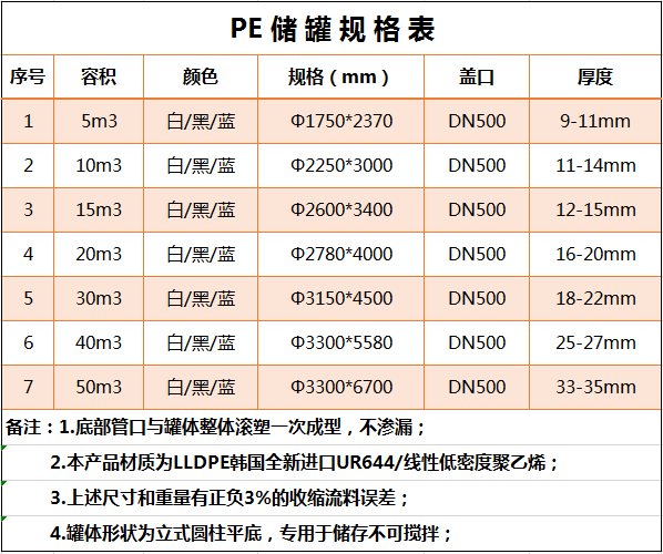 所用材質(zhì)為韓國進(jìn)口聚乙烯(PE)滾塑原料,儲罐一次成型,內(nèi)外光滑,具有良好的衛(wèi)生性與抗紫外線能力,耐酸堿、耐腐蝕、易清洗、不易老化。它可以盛裝在常溫下無機(jī)酸、堿、鹽等大部分物質(zhì)及有機(jī)物,耐熱耐凍 耐熱耐凍性佳,-5℃—+85℃均可使用