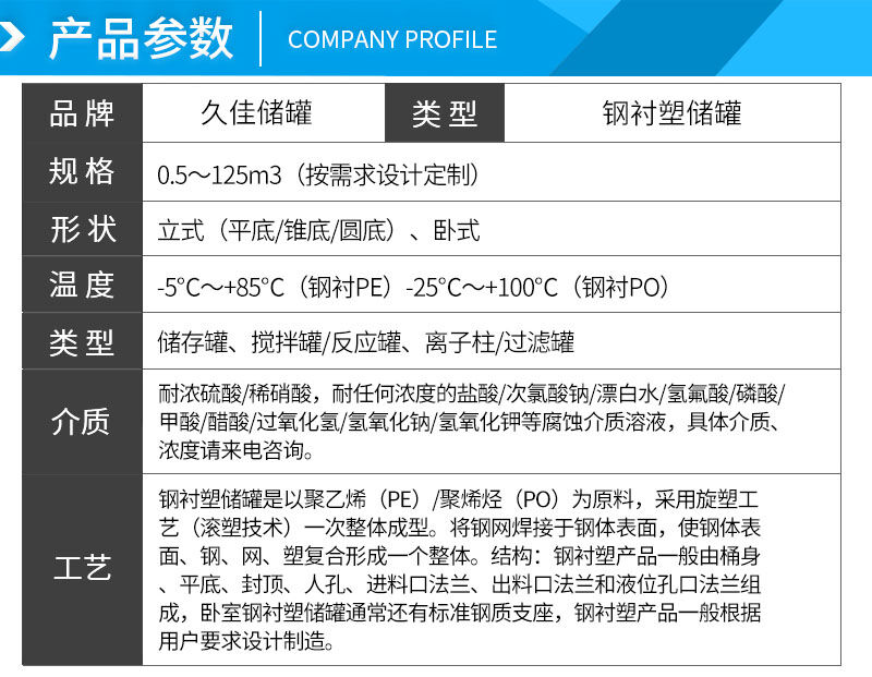 鋼襯塑產(chǎn)品一般由桶身、平底、封頂、人孔、進(jìn)料口法蘭、出料口法蘭和液位孔口法蘭組成,臥室鋼襯塑儲(chǔ)罐通常還有標(biāo)準(zhǔn)鋼質(zhì)支座,鋼襯塑產(chǎn)品一般根據(jù)用戶(hù)要求設(shè)計(jì)制造。