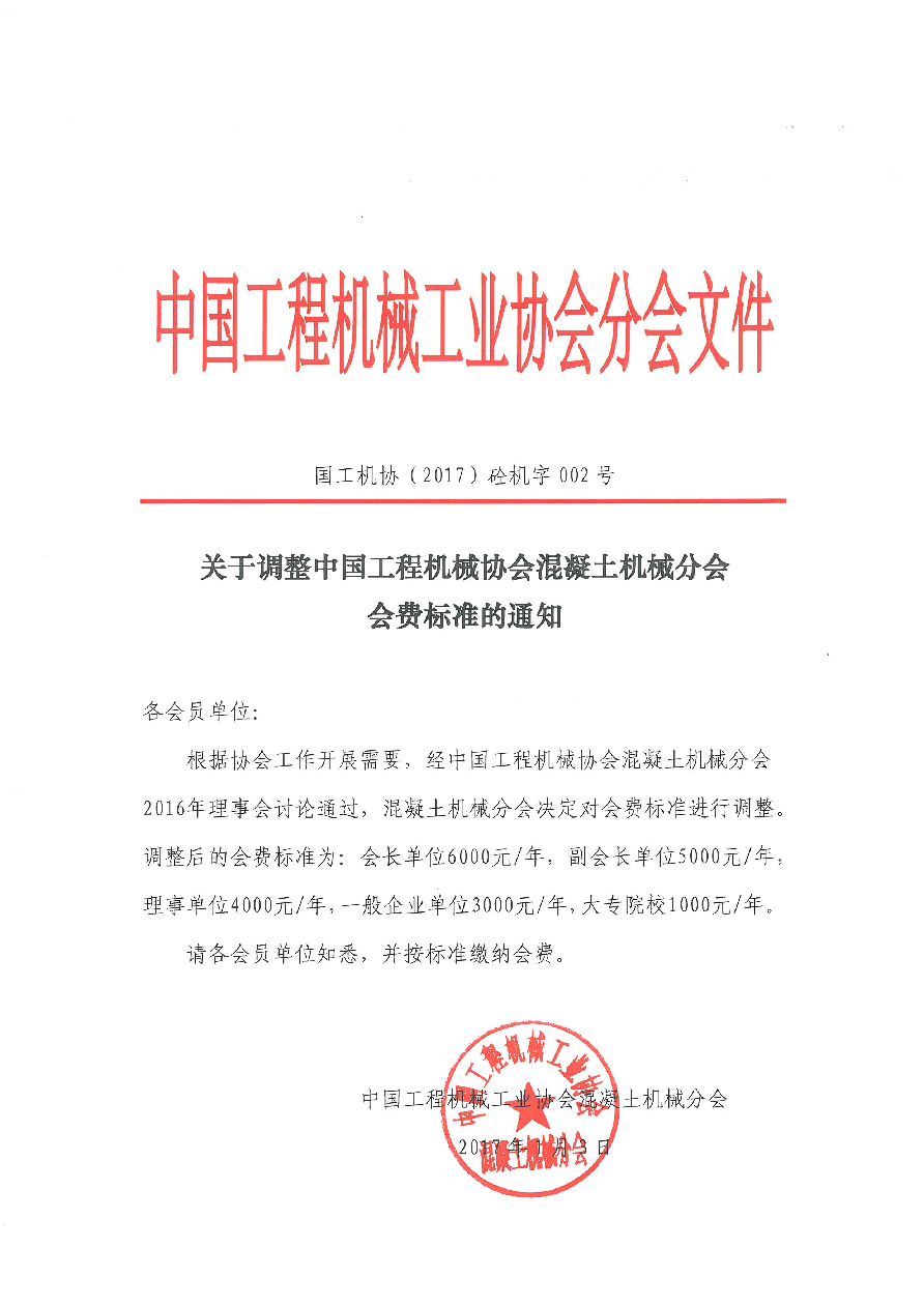 關(guān)于調(diào)整中國工程機(jī)械協(xié)會混凝土機(jī)械分會會費(fèi)標(biāo)準(zhǔn)的通知