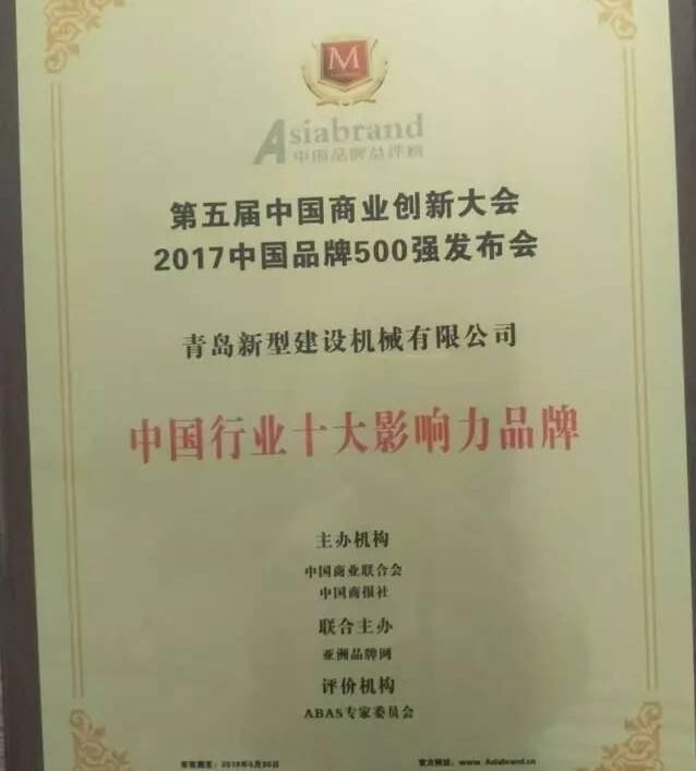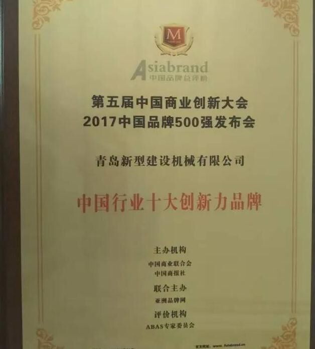 2017年5月31日,以“新品牌、新供給、新未來(lái)”為主題的第五屆中國(guó)商業(yè)創(chuàng)新大會(huì)暨2017中國(guó)品牌500強(qiáng)發(fā)布會(huì)在北京國(guó)家會(huì)議中心隆重舉行。建筑機(jī)械行業(yè)知名企業(yè)中青林集團(tuán)旗下青島新型建設(shè)機(jī)械有限公司受邀參會(huì),一舉榮獲“中國(guó)行業(yè)十大創(chuàng)新力品牌”與“中國(guó)行業(yè)十大影響力品牌”。