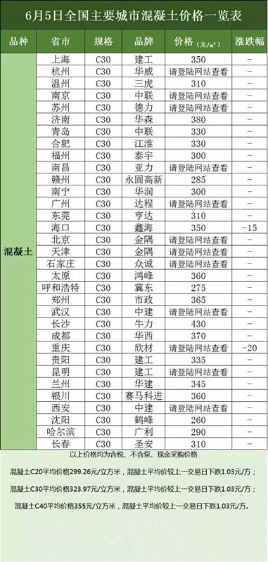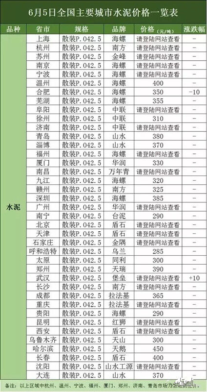 【頭條】6月上旬全國(guó)主要城市水泥、混凝土價(jià)格表