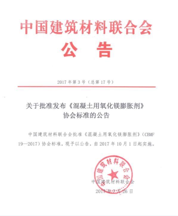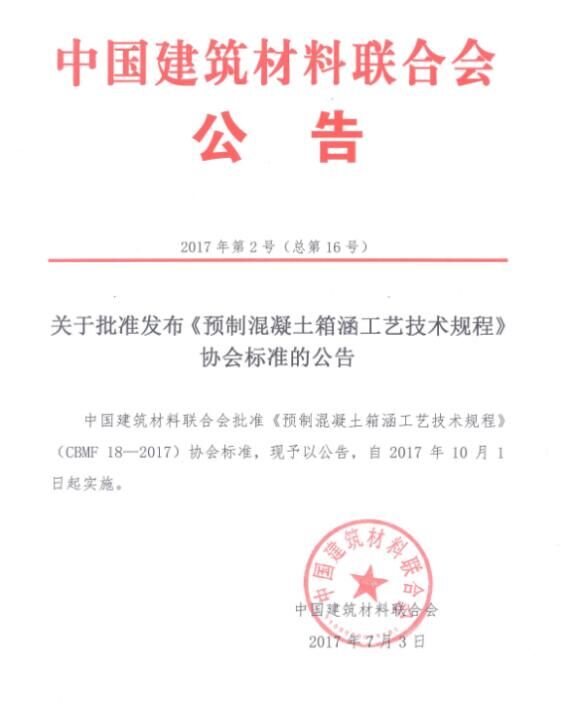 2017年7月,由中國混凝土與水泥制品協(xié)會(以下簡稱協(xié)會)組織制定的《預(yù)制混凝土箱涵工藝技術(shù)規(guī)程》和《混凝土用氧化鎂膨脹劑》兩項協(xié)會標準,通過審定并發(fā)布批準公告,標準號分別為CBMF 18-2017和CBMF 19-2017,將同時于2017年10月1日起實施。這是國務(wù)院《深化標準化工作改革方案》(國發(fā)[2015]13號)及質(zhì)檢總局、國家標準委《關(guān)于培育和發(fā)展團體標準的指導(dǎo)意見》(國質(zhì)檢標聯(lián)[2016]109號)發(fā)布后,協(xié)會與中國建筑材料聯(lián)合會(以下簡稱聯(lián)合會)聯(lián)合發(fā)布的首批協(xié)會標準,兩項標準將公開出版并發(fā)行。