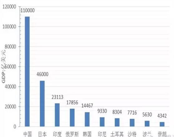 從經(jīng)濟(jì)總量看,GDP超過(guò)1萬(wàn)億美元的國(guó)家5個(gè),分別為中國(guó)、日本、印度、俄羅斯、韓國(guó),其中中國(guó)經(jīng)濟(jì)總量為11萬(wàn)億美元、位居第一、為最小國(guó)家不丹的5800倍,約占“一帶一路”地區(qū)經(jīng)濟(jì)總量的40%;GDP在5000億到1萬(wàn)美元的國(guó)家4個(gè),分別是印尼、土耳其、沙特、波蘭;GDP在1000億到5000億美元的國(guó)家19個(gè),GDP在100億到1000億美元的國(guó)家30個(gè);低于100億元美元的國(guó)家8個(gè),分別為塔吉克斯坦、蒙古、吉爾吉斯坦、摩爾多瓦、巴勒斯坦、黑山、馬爾代夫、不丹,其中經(jīng)濟(jì)規(guī)模最小為不丹、GDP為19億美元。