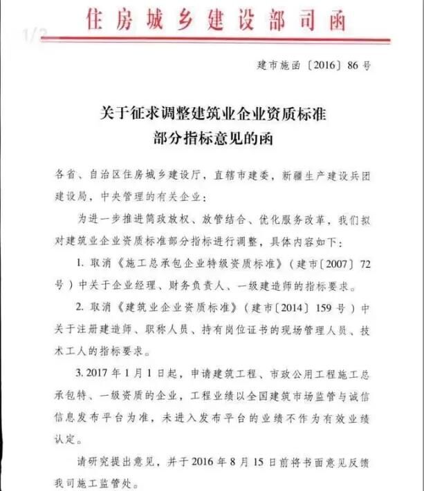 近日,住房和城鄉(xiāng)建設部建筑市場監(jiān)管司就“調(diào)整建筑業(yè)企業(yè)資質(zhì)標準部分指標”征求意見(建市施函[2016]86號),主要內(nèi)容有以下兩點: